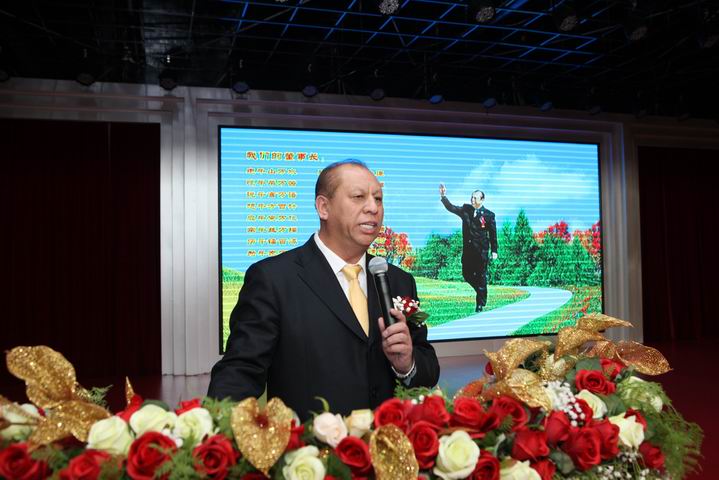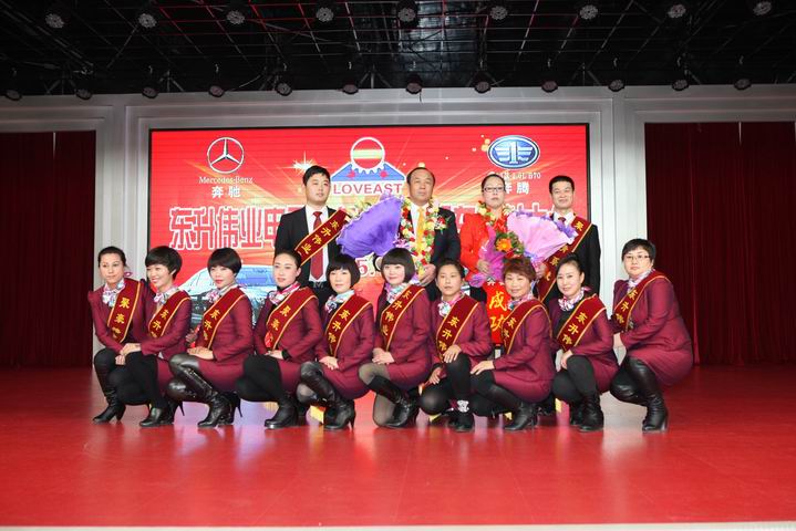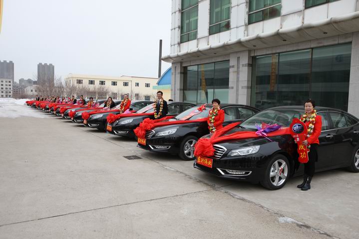 2015年1月18日,北国江城, 瑞雪纷飞、雾凇如花。东升伟业30万平米的健康工业园区彩旗飘飘,红灯高挂;拱门条幅下车辆如梭、人头攒动,处处洋溢着喜庆气氛。大院内一字排开披挂红色绸花的15辆高级黑轿车,在皑皑白雪的映衬下,分外耀眼。
