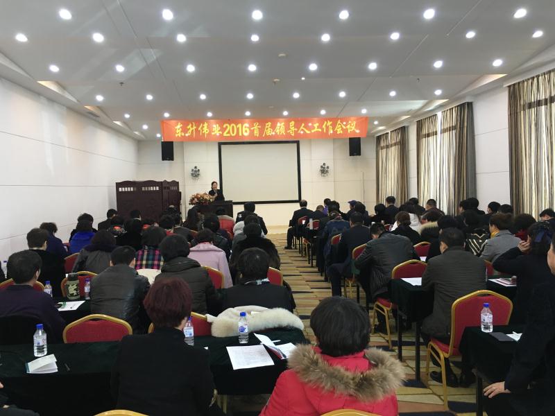2016年2月24日首届领导人工作会议在集团公司总部胜利召开,会上于爱东董事长宣布了新调整后的公司主要领导班子:董事长于爱东,副董事长谢蕙竹,总裁于城,执行总裁周国,商学院院长张咏纯,上市办主任王德奎。于城总裁发表了“同心同德、稳健经营、说实话、干实事、开创东升新伟业”的重要讲话,总结过去、分析市场,明确目标、展望未来,他指出公司今后要把诚信经营、规范运作放在首位,把稳定制度、增加信心做为工作重点,说实话、干实事做为考核各项工作的主要标准。副董事长谢蕙竹女士就公司14年的发展和企业管理、企业文化等方面做了深入细致的分析和指导。执行总裁就下一步工作的具体打算和市场应对措施,做了详细的阐述。于爱东董事长就公司的发展战略和未来规划作出了重要指示,指出东升伟业到了必须先规范后发展的阶段,也到了必须大胆改革创新的关键时期。会后以系统为单位,领导人进行了充分讨论和目标分解,大家对新的一年市场运作充满了信心。