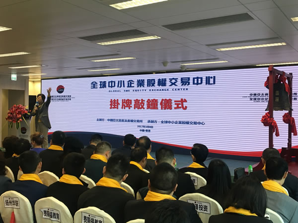 上午10点,主持人宣布挂牌敲钟仪式吉时已到,正式开始。首先由交易所和交易中心的朱新兰总裁讲话,她对前来参加挂牌敲钟仪式的九家企业致以热烈的欢迎,并阐明在全球国际金融中心香港股权挂牌交易的重要意义,她表示将为符合条件的全球中小企业融资发展提供全方位帮助,同时也希望挂牌企业进一步规范“财、法、税”等相关制度,为进一步主板上市做好准备。接着由财务顾问公司郭松华董事长为各企业授牌,随后敲钟仪式正式开始,声声悦耳的国际金钟声赢得了现场阵阵祝福和掌声,彰显了民族企业的希望和期待!