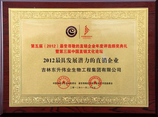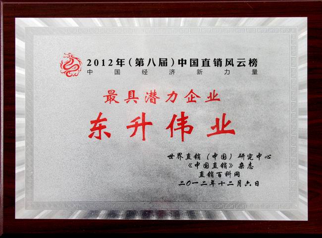 热烈祝贺“吉林东升伟业生物工程集团有限公司”分别在2012年第八届中国直销产业发展论坛、世界直销(亚太)研究中心大会和世界直销(中国)研究中心专家委员会议、中国直销风云榜颁奖盛典上,获得“风云亚太地区最佳创业平台奖”;“中国经济新力量最具潜力企业”;“2012最具发展潜力的直销企业”等殊荣。