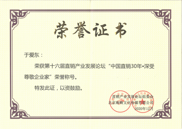 “中国直销30年·深受尊敬企业家“荣誉称号