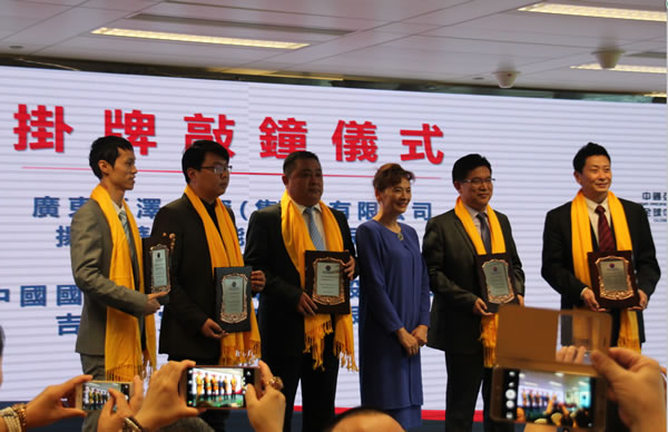 上午10点,主持人宣布挂牌敲钟仪式吉时已到,正式开始。首先由交易所和交易中心的朱新兰总裁讲话,她对前来参加挂牌敲钟仪式的九家企业致以热烈的欢迎,并阐明在全球国际金融中心香港股权挂牌交易的重要意义,她表示将为符合条件的全球中小企业融资发展提供全方位帮助,同时也希望挂牌企业进一步规范“财、法、税”等相关制度,为进一步主板上市做好准备。接着由财务顾问公司郭松华董事长为各企业授牌,随后敲钟仪式正式开始,声声悦耳的国际金钟声赢得了现场阵阵祝福和掌声,彰显了民族企业的希望和期待!