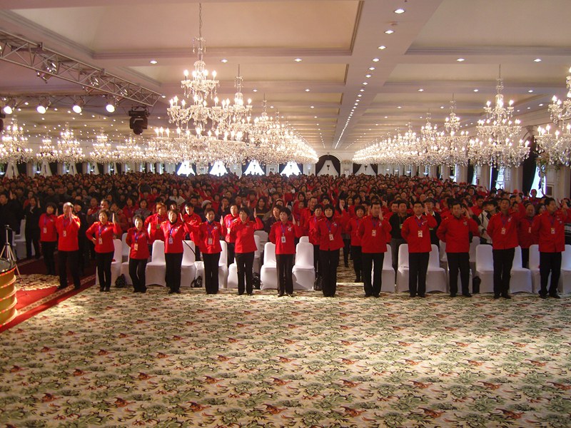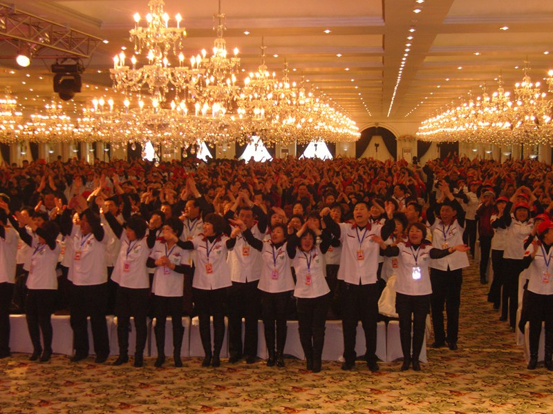 一群人身穿红上衣,头戴小红帽,在佩有白色腰带、紫红喇叭的教官严厉口令下,几百人铿锵有力的步伐和口号。。。。。。转身、敬礼,举旗,一个个统一连贯的漂亮动作,笔者以为是那支部队在军训,询问后才知道,这就是东升伟业华星系统!走在队伍前面的一男一女就是这个系统的灵魂人物---李岩松、矫捷伉俪。